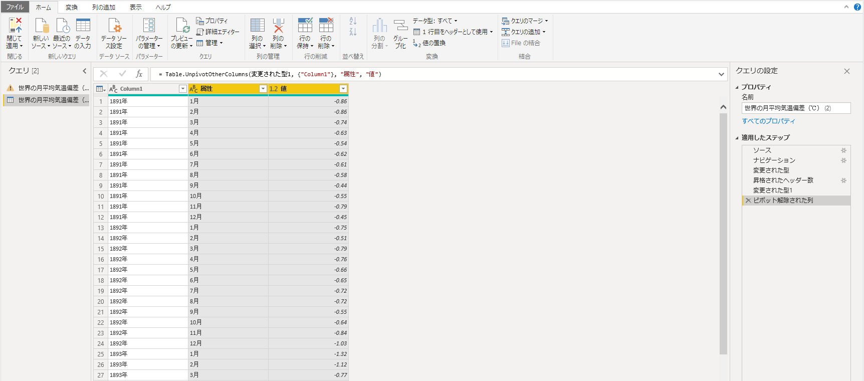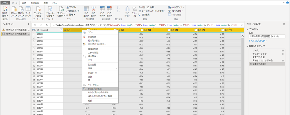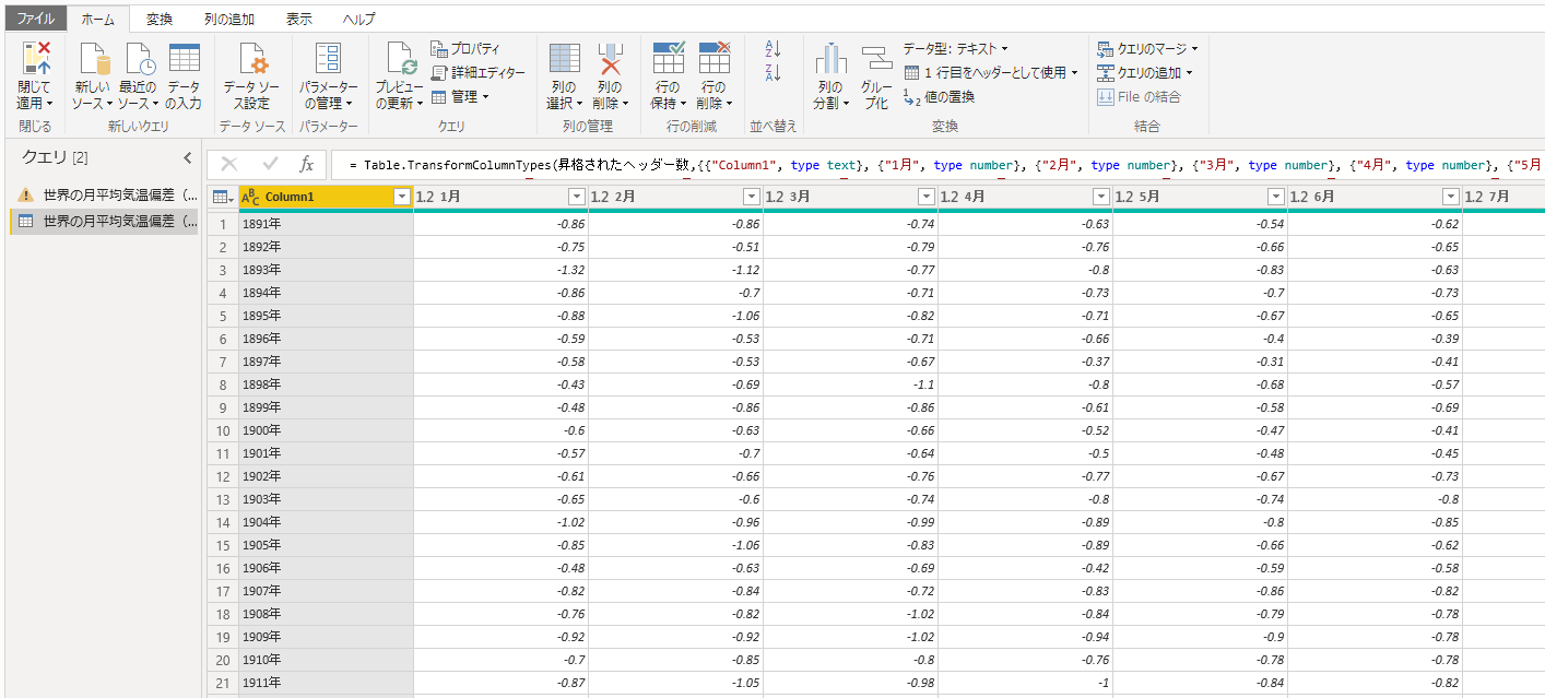 変更された型1 = Table.TransformColumnTypes(昇格されたヘッダー数,{{"Column1", type text}, {"1月", type number}, {"2月", type number}, {"3月", type number}, {"4月", type number}, {"5月", type number}, {"6月", type number}, {"7月", type number}, {"8月", type number}, {"9月", type number}, {"10月", type number}, {"11月", type number}, {"12月", type number}}),
