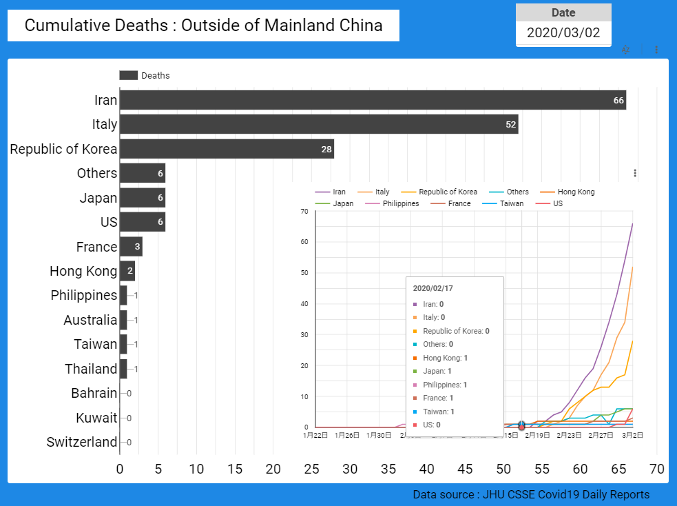 ​今後、中国本土以外の地域への感染拡大が懸念されているため、国別、地域別の感染者数の推移を簡単に確認できるダッシュボードを試作しています。​