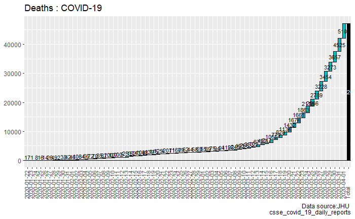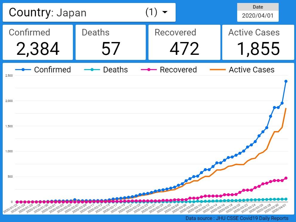 4月1日付のデータは、当初アメリカのデータが抜けていましたが、2時間後に修正されました。アメリカのデータは地域分類が細かくなっていて、1日当たり2千行くらいになっています。