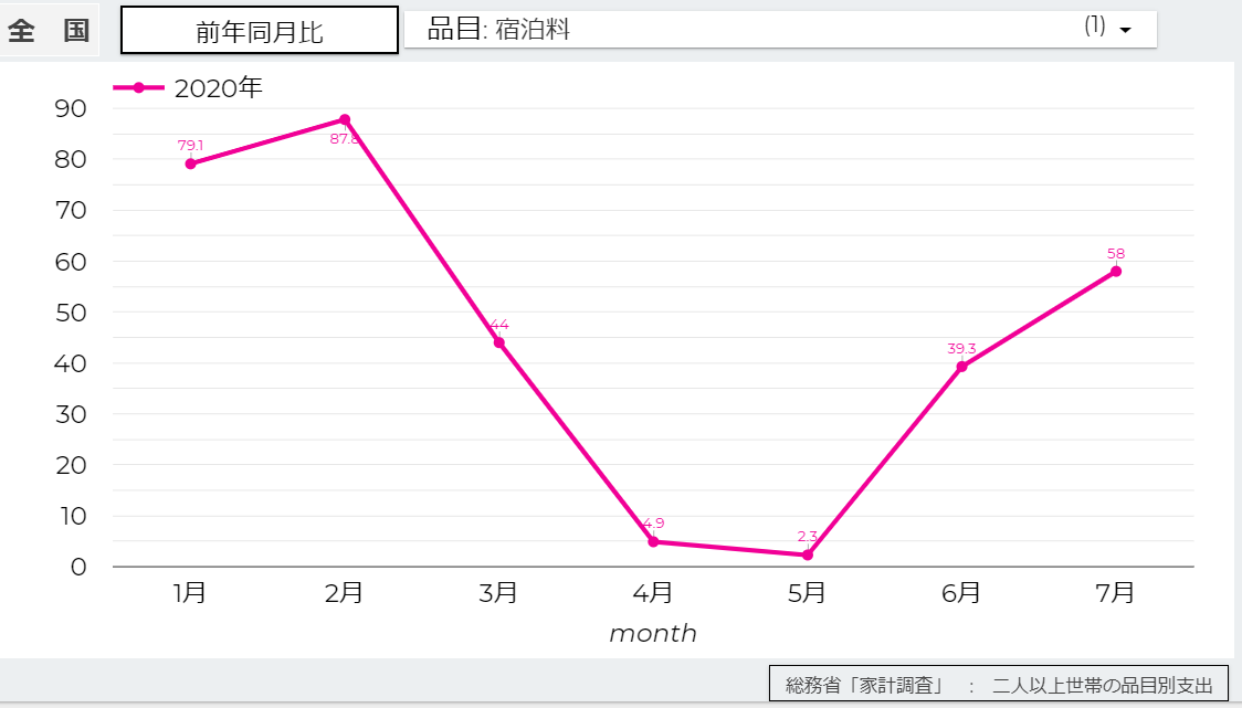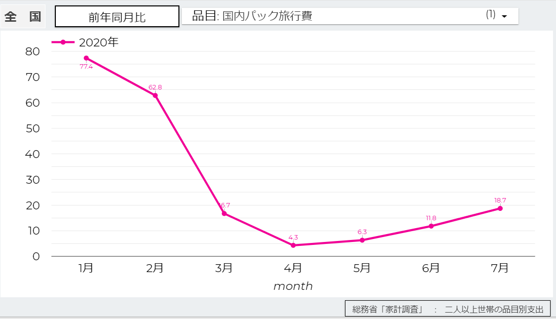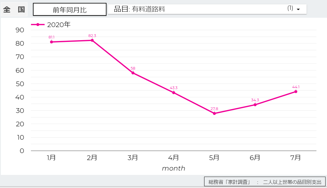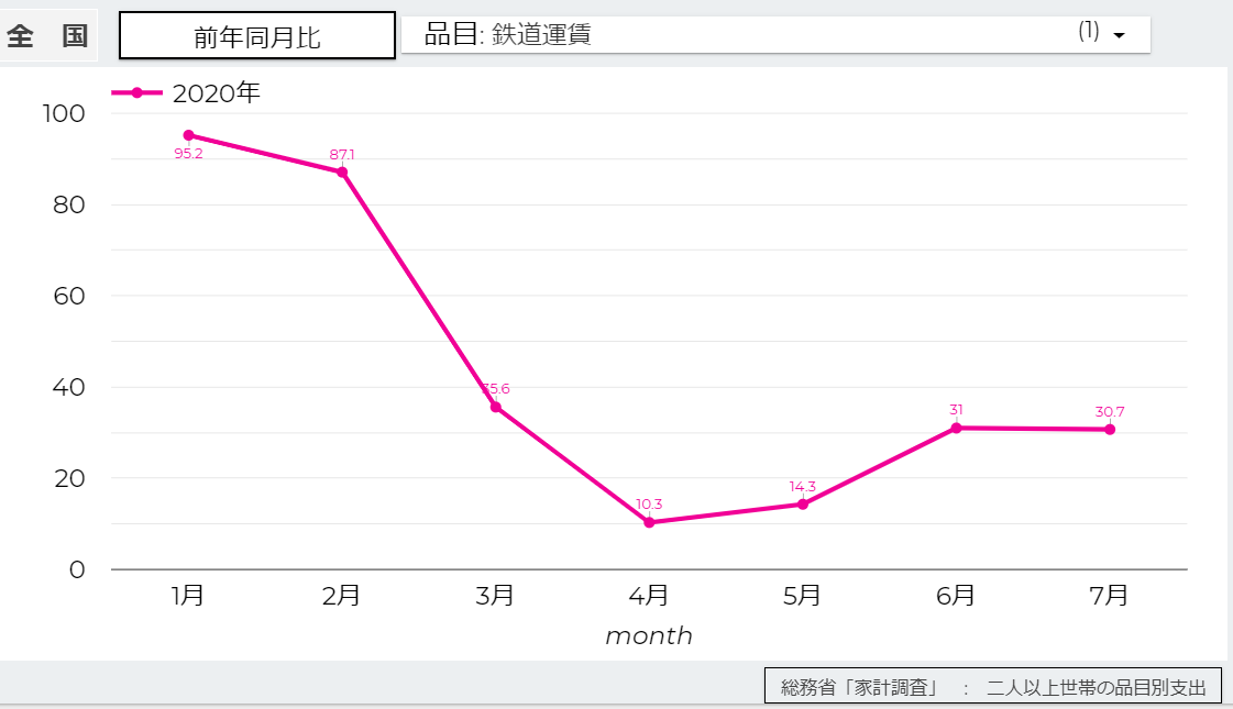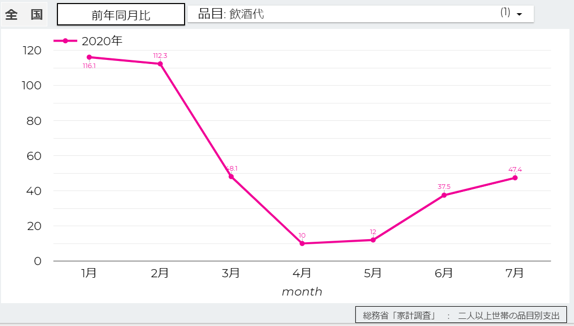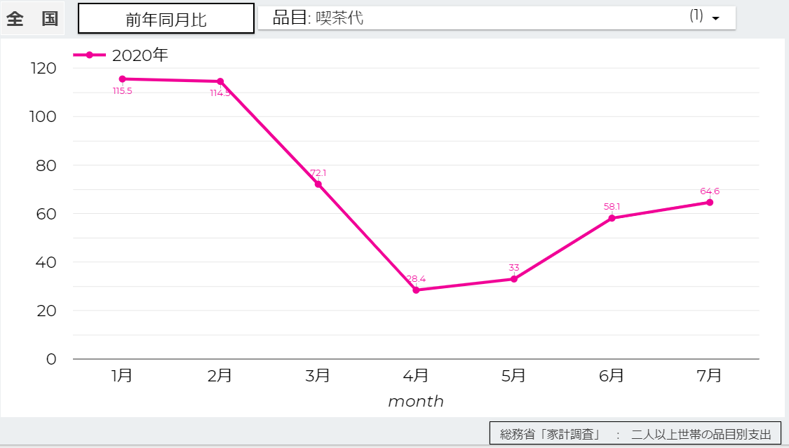 ダッシュボードで、外食費、交通費、旅行費、娯楽サービス費などのデータを見られるようにしていますが、大きく落ち込んだ分野での戻りが鈍いことがわかります。