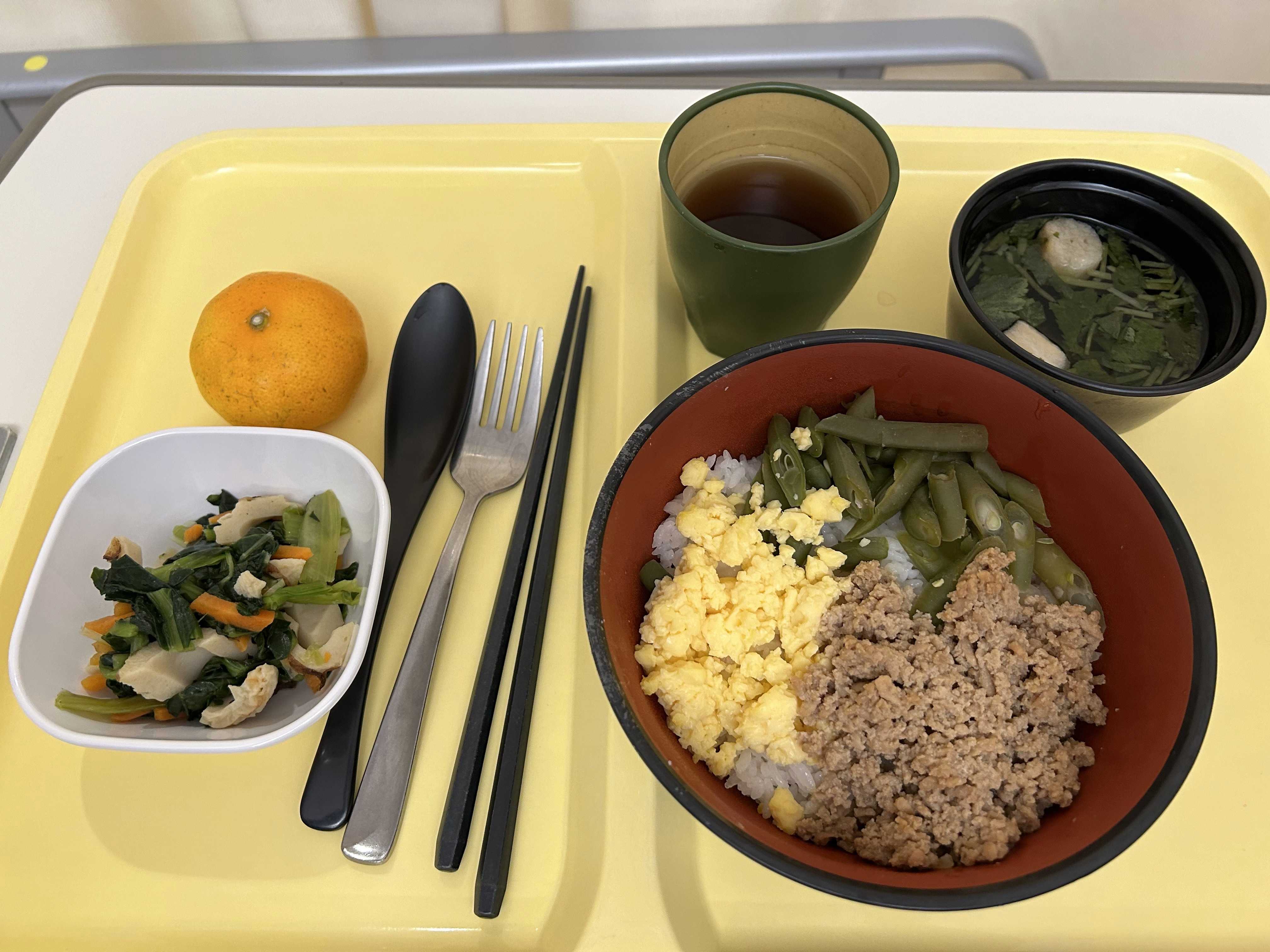 初めての食事は三食丼。私は、消化器系の病気ではないので、「常食」という普通の食事。
