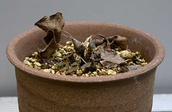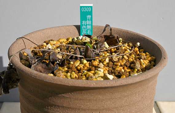 昨年の今頃保有していた雪割草は、ほぼ全滅してしまいました。このポットの主はこの春補充した品ですが、品名ラベルが家出してしまい、品名も分からなくなっています。とは言うものの、花が咲きさえすれば、品名は回復できるので、取り敢えず夏の間に汚損した表土を更新するなど、栽培環境を整えることにしました。 先ずは侵入した雑草を抜き、次いで枯れた葉や葉柄を刈り払います。ここまでで、十分に育った冬芽が露出しました。本来なら周囲を葉にガード(?)されている筈なのですが、まぁ、冬芽だけでも生き残ってくれたことに感謝することにします。この後、少な過ぎた表土を補充して、一通りの手当てを済ませた様子がこちらです。円内は表土補充の過程で見つかった子株です。この子は冬芽が小さ過ぎて、来春花を咲かせることは期待できそうにありませんが、ここで見つかったからには、親と同じ顔立ちであろうことは間違いありません。