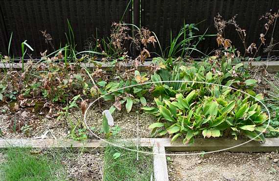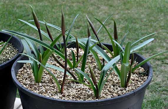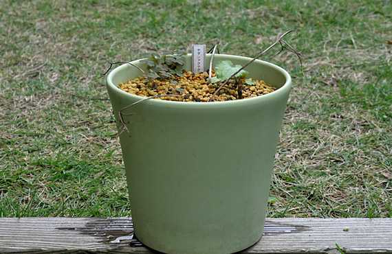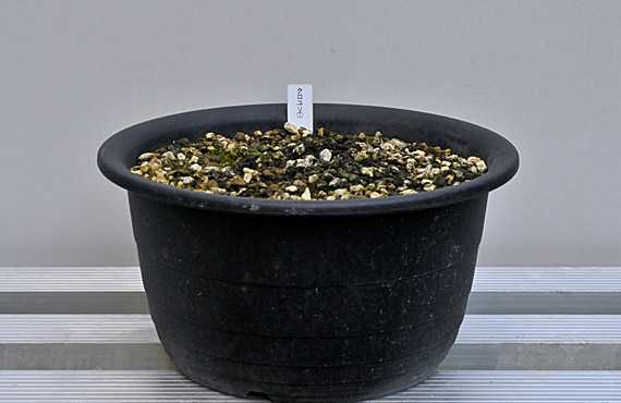 この6年間、作落ちが続いているクロユリです。作落ちに繋がった理由は、球根が四分五裂した結果、花を咲かせるだけの地力を備えた球根がなくなったためと考えています。なぜ四分五裂したかは分からないままです。そろそろ地力を回復して貰いたいところですが、その時をきれいな環境で迎えられる様、植え替えを行うことにしました。 先ずはポットを裏返す様にして、全ての球根を掘り上げました。一時より大きくはなっていますが、花を咲かせるのに十分か?・・・と問われると、確信を持った説明はできません。今回は小さいままの球根は除外して、花を付けるかもしれない、比較的大粒な球根のみ植え戻すことにしました(画像はありません)。こうして植え戻した様子がこちらです。選抜から漏れた小型品は、プチ花壇の空きエリアに植付け、サイズの充実に専念させることにしました。