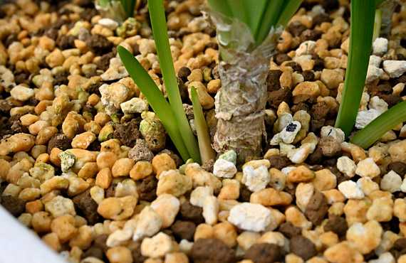 隣り合う様に・・・とまでは言えませんが、ほぼ同じ様な環境に置いていた別の品種が、この夏の暑さに負けて球根がスポンジの様になって枯死してしまったのを受けて、もしやこの子も・・・ということで健康状態を確認することにしました。 この春植え替えたばかりなので、用土は新品同様です。その用土を、竹串で少しずつ掘り崩して行くと、1cmほどの位置で球根のおデコに行き当りました。更に掘り進めて半身が見えるところまで掘り進めた様子が円内です。こちらはどうにか酷暑の夏を凌ぎ切った様で、健康状態は良好と言って良さそうです。そればかりか、球根は分球して増えているではありませんか。来春いきなり花付き・・・というのは虫が良過ぎるかもしれませんが、大事に育て上げることができれば、その次の春には期待しても良さそうです。