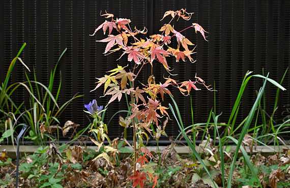 我が家の小庭にも紅葉のシーズンがやって来ました。・・・とは言ってみたものの、実体は甚だ残念な出来栄えです。手持ちのモミジ類の樹齢は2年から5年・・・といった構成ですが、いずれも酷暑に揉まれて甚だしい葉焼けを起こしてしまいました。このため、赤く色付いたのはごく一部に留まり、大半は黄土色、枯葉寸前といった見てくれです。昨年も同様の振舞いでした。この先、標高100m辺りでは紅葉すら望めないという、味気ない時代に突入したのかもしれません。