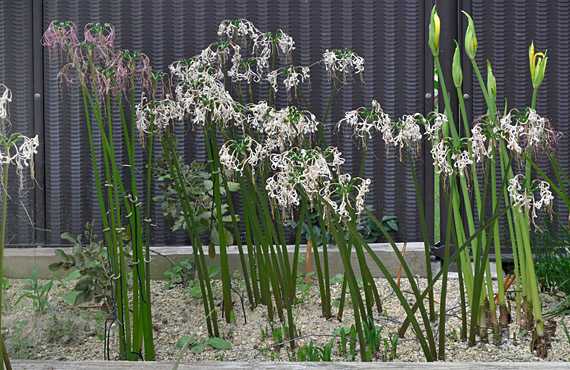 白ヒガン(無銘リコリス・白花)の出葉が始まりました。ギリギリですが花が終ってからの出葉で、辛うじて「ハミズハナミズ」のオキテは保った形です。同時に白花の「アルビ・フローラ)も出葉か始まっています。 これらの2品に共通しているのは、今、葉を出しているのは、この秋花を咲かせなかった個体だけです。花を咲かせた個体は、今は花軸や花の残骸処理で手一杯で、葉っぱにまで手が回らない・・・と言っては不穏当ですが、この花軸の位置から葉を出す関係で、葉っぱを出そうにも頭がつっかえて身動きが取れない・・というのが正しい解釈かもしれません。