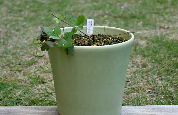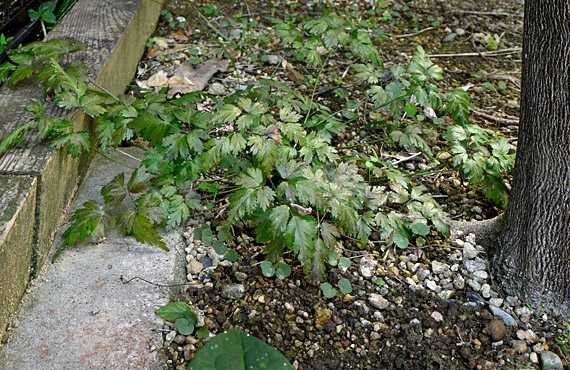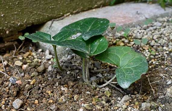 入手後数年間はポットに植えていたコシノカンアオイ(越ノ寒葵)でしたが、健康状態の悪化を受けてこの場所に植替えていました。以来4,5年経ちましたが、環境が品種の特性にマッチしたか、健康状態はグングン改善し、この春には2輪の花を咲かせました。しかしいい事ずくめという訳には行かず、露地植えの泣き所、雨の跳ね返りで葉や花が泥まみれになることや、最良の撮影アングルが選べないなどの欠点が目に付く様になりました。 で、現状の株を2分割し、片方をポットに植え戻すことにしました。当初は固く結合した状態を、力ずくで切り分けることを想定していましたが、意外なことに既に2つに分離していました。但し、根は深さ方向に15cmを超えて伸びており、この掘り上げには手を焼きました。そうして掘り上げた個体を5号ポットに植え付けた様子がこちらです。既に新葉の準備(円内)が始まっていましたが、ツボミになる部位は認められず、この個体は作落ち確定の模様です。