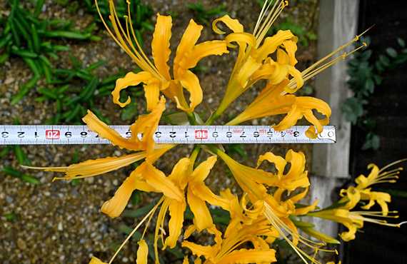 黄花リコリスの「ジャイアント・イエロー」がほぼ満開の域の入りました。で、恒例の最大サイズの計測を行いました。結果は残念ながら、今年は20cmに達するものは出ませんでした。最大サイズは上画像の通り、19cmを少し切るか・・・というサイズです。原因は正確なところは分かっていませんが、本来の休眠入りよりかなり早く葉っぱを刈り払ってしまいましたが、もしかするとこの措置で光合成による養分生成が不足したのかもしれません。来年は、この品種だけでもギリギリまで葉を残すことにします。それに加えて、個体数の適正化も進めてみます。