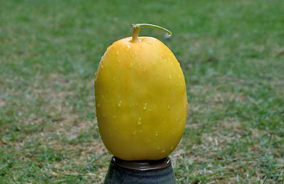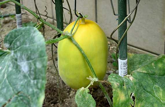 気温の低下傾向に合わせる様に、マクワウリの蔓や葉も精彩を欠く様になって来ました。部分的に黄葉も見られる様になり、実はこれ以上充実することはなさそう・・・ということで、サッサと収穫してしまいました。 収穫時点での大きさは太さ(直径)8cm、長さ(高さ)10cm強でした。キチっと農家で栽培されたものなら、最大の長さが15cmに達することも珍しくないことと比べると、甚だしく見劣りしますが、8月に種蒔きして、2ヶ月で収穫できるのはこの辺が関の山・・・ということかもしれません。ということで、収穫品は少しの間、追熟させて味わうことにします。