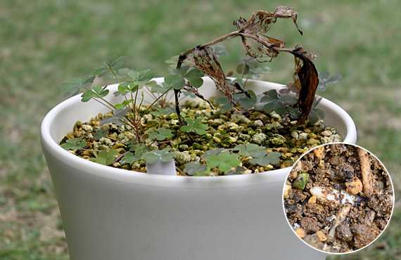 種蒔きした記憶もなく、従って品種など思い当たることがない、不明だらけの大文字草です。葉や葉柄の特徴点から、大文字草らしい、というところは分かるのですが、花が咲くまでは何者かは???のままです。その不詳品も発芽からの年数を踏まえれば、そろそろ花を咲かせてもいい頃合いです。上画像が昨日時点のポットの様子ですが、ポット表面はカタバミが繁茂しており、これに加えて表土の半分ほどにコケ(スナゴケ?)が浸食しています。花期(11月頃)も迫っており、花が咲くかもしれないという期待を表す意味で表土のプチ手入れを行いました。 先ずはカタバミの除草です。株元を竹串で解し、株元を摘まんで抜き上げる、という作業を20回余り繰り返して、全点駆除しました。続いてコケの剥ぎ取りです。コケには根がある訳ではありませんが、表面から10~15mmまで仮根で固まっており、これをごっそり剥ぎ取る必要があります。こうした作業で減った用土を補って一件落着としました。
