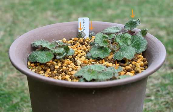 前回雑草と増殖株を駆除して40日ほどが過ぎました。この期間に、再び増殖株(↓)が顔を出し、ファミリー増殖の行動を起こしていました。このポットは植え替えて3~4ヶ月なので、今年は秋の植え替えは見送ることにして、増殖株の間引きのみで済ますことにしました。 ということで、元の3株のみ残し、増殖した個体は抜き上げることにしました。いつも通り対象株の根元の用土を解し、静かに抜き上げます。こちらが今回、間引いた増殖分です。この品種は厳冬期も成長するし、温暖期と比べればペースは落ちますが子株の生成もします。という具合で、一般的な山野草が冬季は静かに休眠する傍らで、ほぼ年間を通じて油断できない相手ではあります。