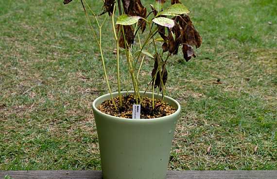 暑さに負けて甚だしい痛手を負った雪割草です。葉は一枚残さず枯れてしまいましたが、何とか本体は命を取り留めました。神戸の高々標高100mの気象は、この品には過酷に過ぎる様ですが、来春の花付きは期待しても良さそうなので、身辺を綺麗にしてその時を待つことにしました。 枯れてしまった葉や葉柄を全て切り払った様子がこちらです。ラベルに記されたメモは「紫 弁白」と読めます。この春、新潟市まで出掛けて手に入れて来た中から、該当する品を右上に(切替)表示します。殺風景な開花風景になりますが、3ヶ月後を楽しみに待つことにします。それまでに仮名称も再割り当てして、各個体が識別できる様にしておきます。