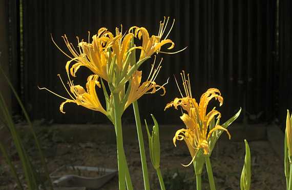 最晩生の黄花リコリス、「ジャイアント・イエロー(仮称)」が開花しました。昨年と比べて1日遅れ・・・ということは、事実上昨年並みの開花、ということになります。この品が、我が家で保有するリコリス9品種の幕引きになります。但し、今年はこれら9品種の内2品は作落ちしてしまいましたが、特段の問題はなく、1品は隔年開花、もう1品は「一勤二休」のペースを順守(!! )している怠け品種です。 ところで、冒頭で「ジャイアント・イエロー」という名称を使いましたが、これは公式なものではなく、我が家だけで通用する仮名称です。ヒガンバナを始めとして、一般的なリコリスは花の包絡線の差し渡し径が15cmに届きませんが、本品は20cmを超えるものが頻繁に出現します。この現象に着目して付した仮称・・・とご理解ください。