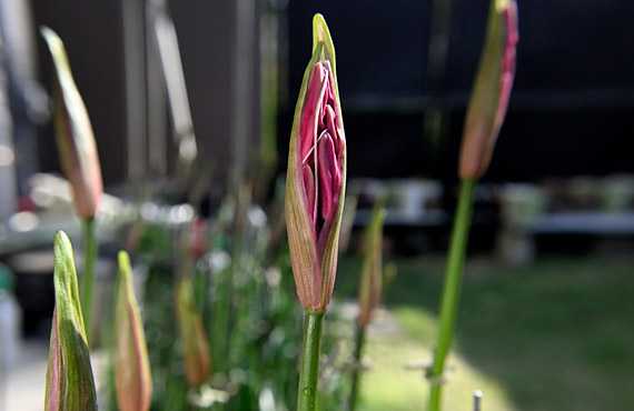 ネリネ「Rosea」が開花を半月ほど先に控えて、花軸の伸びを加速させ始めました。昨日時点で最長寸の個体は30cmに肉薄する勢いです。この段階になると、気になるのが花軸をクネ~と曲げる習性です。太陽を追いかけて・・・とまでは言いませんが、ほぼ真南に向かって深く頭を垂れて、最終的に満開の少し前頃には、この姿勢で固まってしまいます。その状態では甚だ見苦しいので、添え木を当てるなどして姿勢を矯正してやる必要があります。 で、3個ある「Rosea」のプランタの内、先ずは最初の1個に措置を加えることにしました。添え木とは言いながら、実際に当てるのは2mm径のアルミ線です。花軸の根元付近、可能な限り花軸に近い位置に添え木を立て、花軸をを添わせる様にゴム引き鉄線で軽く固定します。現段階では固定箇所は1ヶ所か2ヶ所で済みますが、最終的には3-4ヶ所必要になります。こちらが措置が完了した様子ですが、残る4鉢(ピンク花品も含めて)も日を開けずに措置する必要があります。
