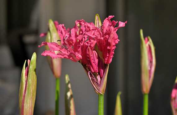 この品も甚だしい痛手を被り、葉は残らず枯れてしまいました。ただ、株としての健康状態は問題なさそうで、来春の花の季節に向け、冬芽を大きく膨らませています。今回はこの品を身綺麗にして、花の時期を迎える準備を済ませることにしました。 ピンセットと先細の園芸バサミを使用して、冬芽を傷付けない様、慎重に枯葉と葉柄を切り払います。全てを刈払い、冬芽の全体像が見渡せる様になると、大小合わせて8芽が確認できました。葉を全て失った反動、或いは余力を、ひたすら株の充実に振り向けたのかもしれません。ツボミの成長も進んでおり、早いものは花弁の一部が覗いています。但し現時点では深紅の筈の花弁が鮮やかな緑で、開花までの2ヶ月半から3ヶ月で大化けを演じる必要があります。