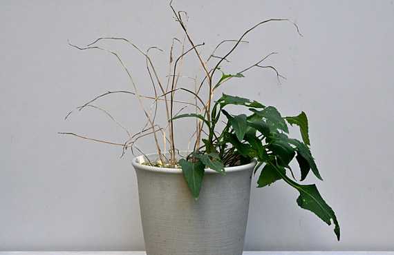 今回はホウチャクソウを植え替えます。夏の盛りの頃、暑さに耐えられず地上部は姿を消してしまいました。元気だった頃の観察では、個体数が増えに増えて混雑を極めていました。更に、住人が姿を消したポットに、スミレが侵入し繁茂しています。今回の植え替えの目的は、浸食したスミレの駆逐と、主たる住人の過密の解消です。 いざ掘り上げようとすると、増殖した主たる住人と闖入者の根が絡み合って、ポット内でビクとも動きません。とは言え、全ての作業はこれを抜上げなくては始まらないので、力業で強引に抜き上げました。双方の根を1本ずつ解しながら分離します。全体の分離に30分ほどかかってしまいましたが、10株ほどのスミレは全点追放しました。ホウチャクソウの方は全体で20個体ほどありました。内、7個体をポットに植え戻し、6個体をプチ花壇に移植し、残りは処分しました。ポット植えの用土には適度に化成肥料を施しています。植え付けを終えた様子がこちらです。もう少し数を絞った方が良かったか、という反省点がない訳ではありませんが、来春の様子を見て、以後の手入れに反映することにします。