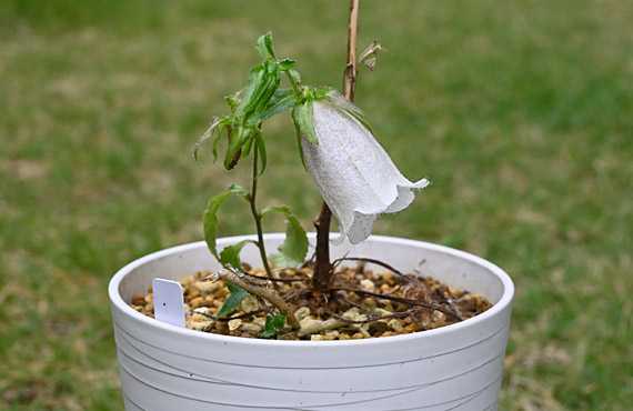 早い地域では紅葉が始まっているこの時期に、あろうことかホタルブクロが咲いてしまいました。何という生命力、何という執念。最早驚きを通り越して、呆れる他ありません。 この個体の素性は、青花ホタルブクロのポットに発生した新株です。昨年の今頃、そうした新株から1株だけ選抜して現在のポットに植替え、そのまま屋内に収容して冬を過ごさせました。その間、季節的には寒のさ中にも関わらず、数本のランナーを出し、その先端に新株を生成させましたが、今はそれらの新芽は確認できません。この春、通常の青花品より1ヶ月ほど遅れて初花を咲かせましたが、花は期待を裏切って白花でした。 その後、9月に入るまで断続的に花を咲かせ続けました。この花期の長さも半端ではありませんが、それに上乗せするのが今回の開花です。昨年の厳寒期を屋内の14~5℃のゆる~い環境で過ごさせたことで、季節感に変調を来したのかもしれません。この冬は、通常の寒空の下で過ごさせ、来年の振舞いを見守ることにします。
