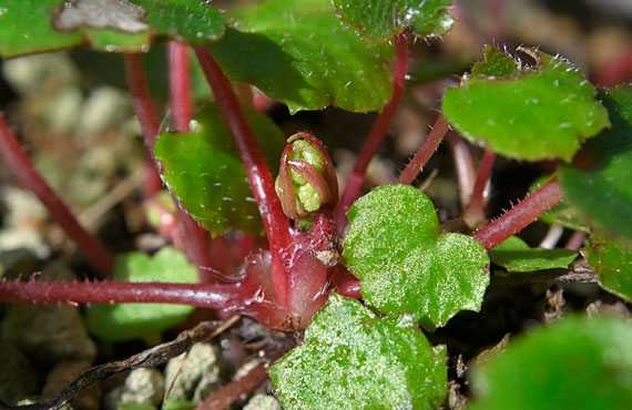 ユキワリイチゲが芽出しを始めました。昨年より8日早い始動・・・と単純に比較はできません。昨年芽出しに気付いた時には、葉がもっと大きく伸び上がっていました。こうした要素を考え合わせると、4日か5日早い、というのが正しい評価かもしれません。登場時の出で立ちは中々の渋さで、全身茶色です。華やかな緑とは一線を画しています。 それはそれとして、この品種もアイドリング期間は極めて長い方に属します。葉を出して花芽が始動するまで4ヶ月近くもかかります。但し、寒さにはめっぽう強く、表土が凍結する様な環境下でも凍死したり、寒さで葉や葉柄が障害を来すことはありません。