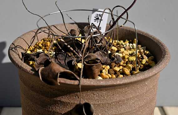 黄花リコリスの「山の根ゴールド」の、残していた花軸が枯れ始め、とうとう倒れ伏してしまいました。種子はどうなった?・・・ということで、採種したサヤを割り開いてみると、円内の様な種子が出て来ました。いずれも黒々として光沢感があります。因みに、右下の一回り小さいものは、1週間前に採種した個体です。 折角採取した種子なので、これが発芽するかどうか確認したい・・・というのが、園芸愛好家の自然な反応です。ということで、屋内で邪魔にならないサイズのポット(2.5号)に種蒔きした様子がこちらです。水遣りで手抜かりを起こさない様、洗面所の片隅に置いて、日々観察を続けるつもりです。