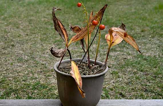 今回は日本スズランの植え替えをご紹介。上画像は、この春この品種として我が家史上最高の花付きを達成しましたが、その裏で最後の植え替えから丸々2年が経過しており、ポット内はさぞかし・・・と思いを巡らせつつ、掘り上げた様子がこちら。完膚なきまで根が回り切って、白い塊に成り果てています。 植替えには、先ずこの塊を解さなくてはいけません。どこから手を付けるのがベストか、右から、左から、後ろから・・・と、眺め回しましたが、ここっ! というポイントはに見つからず、ヒゲ根が短そうな場所から解しにかかりました。結局、この解し作業に1時間以上を費やしてしまいました。 こうして手間をかけて取り出した中から、冬芽のサイズが大きいもの5点を選抜して、新たなポット(6号プラ鉢)に植え付けた様子がこちらです。感覚的に、来春も5芽の花茎を期待しても良さそうです。定着前に極端な冷え込みが来ないことを祈るばかりです。