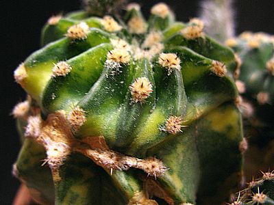 前回のサブデヌダータに引き続き、プシスの花が咲きました。エキノプシス・短毛丸の斑入り種世界の図(Echinopsis eyriesii f.variegata)です。サボテンにハマるきっかけを作ったのがこれの親です。(これは掻き仔)親は当時、私がまだサボテン栽培に不慣れだった為(今もそう変わりませんが)管理が悪くて残念ながら枯れてしまいましたが、何とか子は生きています。途中生長点がくっついた様になり、大きくなるに従って割れてきてしまいましたこう見えても10年以上経ってます。(その割に大きくなってませんが)短毛丸らしく仔吹きがスゴイです。以前はマメに取っていましたが、最近面倒になって放っておいたら仔が大きくなり過ぎて取れなくなってしまいました(こんな事するから親が大きくなれない…)そして、やっと10年越しの念願の花が・・・咲きました!やったぁ~♪何か、混じってますねぇ・・・元々短毛丸だから、花は白いのかなと思っていましたが、薄いピンクです。でもこれはこれで綺麗なのでいいかな?本体がまだ小さいので、花も7cmくらいのかわいい花でした。花は小さくても、花筒はこんなになが―――――い実は朝写真を撮った時はこんなだったんです↓夜になり、もう萎れているだろうと思って見てみると、朝よりも更に開いていたので写真を撮り直しました。今日は天気が良くなかったのですが、それで夜までもったのか、それとも交配種で何かが混ざっているからもったのかはよく分かりません…もう1つ、仔の方にも蕾が付いているのでまた楽しめそうです。これからどんどん咲いてくれるといいな~♪