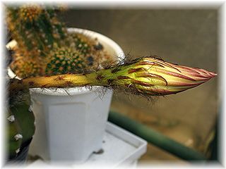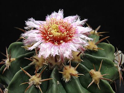 今日は何日か振りに安定した晴れの天気でした。気温は少し低めだったものの、日差しがあったので、日の当たる場所は暖かい~我が家のビニ温内も温度が急上昇。放っておくと40度を遥かに超えてしまうので、通風が必要です。でもこれからの季節は、通風を図るだけでは不十分なので、寒冷紗等で遮光して光量を調節し、温度が上がり過ぎるのを防ぎます。そんなビニ温内では、サボテン達が花盛りを迎えています。今日はちょっと変わった花を付けているサボテンを一つ、紹介します。ホマロケファラ・綾波です。(タグには「短刺綾波」と書いてあったが、思うほど刺短くないんですけど… でももっと刺が長い個体もよく目にするから、それに比べると短いかな)Homalocephala texensis鳥の羽をを思わせる、独特な花を付けます。開き切ってますね~。昨年から咲く様になってくれて嬉しいのですが、花は1輪しか付けてくれないのでちょっと寂しい…綾波は本当は実も綺麗なんです。(本でしか見た事が無い…)自家受粉はしないので、結実する為には最低もう1株必要で、去年手に入れたのですが、新入りの方はまだ花を付けてくれないので、実の方は当分見られそうにありません。でもいつか生で見てみたいですね。来年に期待します