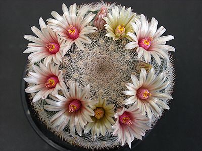 …なんだか訳の分からないタイトルになってしまいましたが「痛くないサボ達シリーズ」は暫しお休み。今日は今、花盛りのサボテンについて紹介します。マミラリア・満月(Mammillaria candida var. rosea)くん。一昨年は小さいながらも花を付け、目を楽しませてくれましたが、昨年はどうご機嫌を損ねたのか、一度も花を付けずじまい。ただ図体だけはぐんと大きくなってきたので、今年は期待しておりました。すると、今ではこの状態に!マミラリアの特徴、上部にぐるっとクラウン状に花を付けます。一つ一つの花も淡いピンク色で、なかなかGOOD!↓ちょっと気分が滅入った時も、これらの花を見ていると癒されます。他にも花盛りのサボ達がいっぱいいます。(また今度紹介しますね♪)このところの暖かさでプシス系も蕾が大きくなってきたので、これからが楽しみです。◇観葉植物◇サボテン◇マミラリア 満月 2.5寸 満月はかなり大きくなりますよ~。 小さいうちは単頭ですが、そのうち仔吹きして群生します。 群生した大きなものも見事ですが、私は小さくてこじんまりした株が 可愛くて好きです。(ベランダ狭いし)