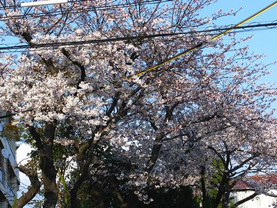 家のすぐ近くの桜の並木(数本ですが)。団地の裏道沿いに植えられています。ここ暫く肌寒い日が続いていましたが、季節は前に進んでいる様で綺麗に咲いてきました只今満開一歩手前。ちょっとしたお花見気分が味わえます。(ここは生活道路なので、流石に敷物を引いてどんちゃん騒ぎは出来ませんが…)姫が、修了式の日には学校の桜もぼちぼち咲き始めてたと言ってたけど、入学式までもつかな・・・