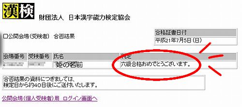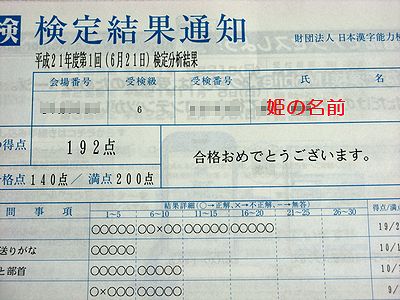 今日は親バカ度満点のムスメ自慢な話をば。「そんな人んちの子ども自慢の話など聞きたくもないわ」という方にはスルー推奨。先月の終り頃、週1で通っているお習字に迎えに行くと、なんだかいつもよりニヤけた感じの姫の顔もしかしたら…と思っていると、先生が「姫ちゃん、2段になりましたよ~」おお~~っ。やったじゃ~ん!暫く昇級しなくて、最近ではお習字に行くのが半分嫌になっていた姫でしたが、これには流石にニンマリ。ここのお習字教室には、姫が幼稚園の際の同級生が数多く通っていて、その殆どが幼稚園時代から通っているのに対し、姫は小学2年生からと、スタートは他のお子さんに比べて遅めでした。でも、今ではこの教室の同学年の中では、いつの間にか上位の方になっています。(上の方の子が何人か辞めてるっていうのもあるんですが)ここは硬筆しかやっていないので、親としては本当は毛筆も習わせたいのですがここまで来て、新しい教室に変わってしまうのも勿体無い気もするし。子どもにとってはみっちり教え込まれるのではなくて、子どもの気分に合わせて気の乗らない時は無理強いせず、ノっている時は気の済むまでやらせてくれるというゆる~い感じがいいみたいです。(それに何より、月謝がお安い!←これが一番かも)これでもう少し家でも気を入れて練習すれば、もっとすんなり昇級するんじゃないかなと思うんですが…(…ちょっとそれは無理っぽい…)それでも、これでまた張り合いが出来て、これから先も続ける気になってくれたかな?その次はこの間受けた漢検の結果。7月10日の午前10時以降に、ネットで合否が見られるとの事だったので、ドキドキしながらも早速確認。そしたら…合格してました~♪ぶいっ!・・・ホッ=3。ネットでは合否結果が分かるだけなので、点数については後日送られてくる結果を見ないといけませんが。ま、6級ですからねー。将来1級合格を目指す姫としては、こんなところで落っこちる訳には行きませんわな(笑)それでは11月は、5級受検、頑張って頂きましょう♪私としては、中学に入ると定期テストやら部活動等で漢検受検の為の勉強時間はなかなか取れなくなると思うので、小学生のうちに、行けるところまでいってほしいですね。将来は1級合格是非実現してほしいです。