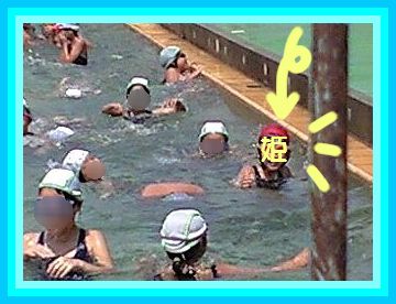 またまたバックデイトで書いております…(昨日のうちにUPしたかったのですが、寝落ちしてしまいまして…)今日は姫のプール今年度最後の日。(姫たちの学校は、水泳の授業は1学期だけなのです)きっと今日は最後だし、検定をすると思ったので、家事が一段落した後、ちょっと見に行く事にしました。プールは1・2時間目で、私は1時間目の途中から行ったのですが(それでも暑かった~)その時は泳ぎの検定は既に終わっている様で、「いるかジャンプ」の練習をしていました。それが終わると最後のプールらしく、お楽しみの時間先ずは先生たちがプールにボールを投げ入れ、沈んだボールを拾ってその数を競う「クラス対抗 ボール集めゲーム」姫は潜るのが苦手なのですが、それでも頑張って潜っていました。(この競技どのクラスが一番だったっけ?…忘れた)その次は「プールDEドッジボール」こちらもクラス対抗。ビーチボールの様な、水に浮くボールを使ってやってました。姫は例によって端っこで待機。相変わらずボールは複数使ってましたが(今のドッジは2個以上使うのが流行りなの?)運動場でやるドッジと同様、白熱した試合が展開されていました。姫、何とか当てられず、逃げ切って試合終了。試合結果は2組(姫のクラス)と1組が同率1位でした。最後は皆で同じ方向に回って、「即席流れるプール」を作りました。あ~…気持良さそう…(携帯のカメラなので写りが悪い…)姫は時々仲良しのKちゃんと、泳ぎの練習をしていました。(結構熱心に練習してるんですけどねー。 何故か上達しないんですよねー、これが…)学校から帰ってきた後に「検定って今日朝1でやったん?」と聞いてみたら、「今日はやってへんよ。この前やったから」との事。で、肝心の検定結果私:「じゃ、(記録)何メートルやったん?」姫:「9メートルやった」私:「・・・」お―――い!去年より記録、落ちとるやないか――いっ!!(去年の記録は11メートル)…夏休みも頑張って、学校のプール(=補習)、行ってもらいましょう!(即決)応援するから、頑張れ~~