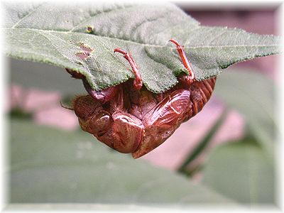 今日は朝から暑い日でした…ふぅ…=3昨日はとうとう我が家でもエアコンをつけました。本音を言うと、夏休み近辺まで、もう少し我慢しようと思ったのですが、(近所でも、今まではエアコンつけてるところはあまり無かったし)姫が沢山あせもを出してしまったもので。あせもも酷くなると治るのに時間が掛かるので、これではいけないと、エアコンをつける事にした次第です。大人はなんとか我慢出来ますが、流石にあせもを出してる子どもに、我慢させる訳にはいきませんからね。でも、私一人でいる昼の間は勿体無いので窓という窓を全部開けて、後は扇風機を軽くかける(弱で)くらいですね。それでも暑いときは「楽園スタイル」ですね…(どんな格好をしているのかはご想像にお任せします…このまま外へは出られません←お客さんが来ると確実に慌てます)先週半ばくらいから、蝉も鳴き始めました。その少し前から、家の前の植え込みに抜け殻が見られる様になりました。(虫画像(抜け殻ですが)注意!)この辺りの蝉は殆どクマゼミなので、超煩いんだな~。これが。(アブラは時々いますが、ミンミンなんてここ何年も聞いた事がありません)家の斜め前に公園があるので、そこの木によく蝉が集まってきてそれだけでも結構煩いのですが、家の前の植え込みの木とか、家の壁に止まって鳴かれた時にはもう、煩いのなんのって…「煩い(うるさい)」という字、「五月蝿い」とも書きますが、いっそ「七月蝉い」とか「八月蝉い」(※クマゼミ限定)とかの方があってると思うぞ!(断言)これから先、暫く蝉の鳴き声に悩まされそうです。 ≪番外編≫先日、急に雨が降ってきたので、洗濯物を入れようとしたら小さな小さな訪問者が。テントウムシです。どんどんに上に登ってきて、この後何処かへ飛んで行ってしまいました。無事に雨を避けて、安全なところに行けたかな?
