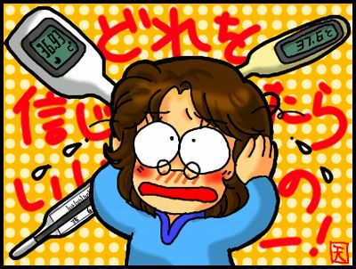 …といっても、今回は姫ではなくて私の事なんですが。昨日、朝~昼は何ともなかったのに、姫を学校に迎えに行って帰って来ると何とな~く喉に違和感が。一応うがいをして、トローチを「投入」するも、喉の痛みは治まるどころか寧ろ増すばかり。「これはヤバい、風邪ひいたな」と思って暫くすると、今度は背中に悪寒。「絶対熱出てるぞ、これは」と体温計を入れてみると37.4℃…微熱です。喉の痛みと多少の鼻水、それと少し頭が痛いというか、重かったので貰っていた薬を組み合わせて飲んでおきました。(↑経験上分かってるのでやりましたが、よい子はあまり真似しないで下さいね。危険な場合があるので)そこでふと頭をよぎったのは新型インフルエンザの事。大人は新型に罹っても、あまり熱が出ない人もいるって、姫のかかりつけの先生が言ってたな・・・でも頭痛の薬を飲んでから、熱は下がって来たし、インフルエンザ特有の、あの「ドーンと何かが圧し掛かってくる様なしんどさ」とか、関節痛が無いので、一晩様子を見る事にし、今朝早速近くの内科に電話を掛け(私のかかりつけ医。姫とは別の病院なのです)、朝一で行って来ました。発熱で受診という事で、最初は一旦別室に突っ込まれましたが、元々微熱である事、頭痛薬を飲んでからは一応下がって来ている事から、インフルエンザではなく、風邪だろうという事でした。ひとまず、安心。よかった…でも「今後熱が上がってきたらインフルエンザの可能性も あるから、その時はまた電話して、また来て下さいね」だそうで。じゃ、どうすりゃいいのさ。このワタシ。(↑これが節つきで歌えた方は相当なお歳かと(笑))微熱くらいで休めないのが、主婦のツライところ。誰も助けてくれないので、お昼に買い物にも行って来ましたけど、大丈夫かなぁ。このまま熱が下がって、新型インフルエンザでない事を祈るばかりです。 ところで、我が家には幾つか体温計があります。電子体温計と、従来の水銀の体温計、それと基礎体温計測用の婦人体温計。(卵巣嚢腫を持ってるので、毎日基礎体温を測らないといけないんです)で、今回、最初に電子体温計で測ったのですが、自分で思っていた体温より、明らかに高い。「これじゃ高過ぎるやろ―」と思った私は水銀ので測ってみたのですが、先の電子体温計の値とは1℃近い差が。それで、最終手段、婦人体温計(舌下温)で測ったら、今度は電子体温計と水銀体温計との間(でも水銀の値に近い)数値が。――― 一体、どれを信用したらいいんでしょうか…(測り方が悪かったのかもしれませんが…)ランキング急降下中(泣)どうか皆様の「愛の手」ならぬ「愛のポチポチ」を宜しくお願い致しますm(_ _)m 1日1回1クリック~♪