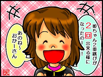 先日学校から帰ってきた姫。満面の笑みをたたえて「おかーさん、今日はとっても良い事があったの~」私:「えっ、何?」姫:「二重跳びが 2回出来る様になったの~」…おおおお~~っ!!「2回くらいで、何を大袈裟な」と思われるかもしれませんが、障害の特性上感覚統合が上手くいかない事もあって、姫は幼稚園の時、皆が楽々と縄跳びをしてる中で全く出来ず、本当に酷かったんです。それが小学校に入学してから練習を積んで、歩みは他の子より遅くとも段々上手になってきました。今では後ろ跳びや交差跳び等も出来る様になってきましたが、今まで二重跳びだけは、どうしても出来なかったんです。(どうしても縄が2回分回せない…)それが2回でも出来る様になったんです!これは本人も嬉しかったみたいで、嬉々として報告してくれました。(学校では高く跳びあがれるよう、ジャンピングボードを使って練習するのだそうです)先週は通ってる習字教室で、先生から「お母さん、姫ちゃん(段が)上がってましたよ~」と言われたし、なんだか最近ちょっぴり嬉しい事が続いています。これで、勉強や宿題を自主的にやってくれれば、もっという事無しなんですがねー。(そこまで望んではいけないか…(笑))いよいよ子ども達は冬休みですね~。今回姫達の学校は新型インフルエンザが猛威を振るって学校閉鎖が行われた為、休み前の短縮授業は無く、ギリギリまで6時間授業。休み明けも始業式の日から給食アリの6時間授業です。(学校閉鎖の前に学年閉鎖をした4・6年生は、6日から6時間授業…)姫はブツブツ文句を言っていますが、先にいっぱい休んでるんだから仕方ないですよね。まずは計画的に宿題を片付けて、ゆっくり新年を迎えたいものです。(私は片付けだ~。年賀状も追い込み~)ランキング急降下中(泣)どうか皆様の「愛の手」ならぬ「愛のポチポチ」を宜しくお願い致しますm(_ _)m 1日1回1クリック~♪