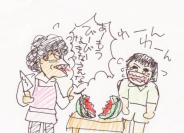 こんばんわ、やまげん・山猫母です。暖かくなってきました。冷え性の私には、これからがありがたい季節です。寒いのより熱いのがマシだ。こんなに寒がりなのに中学生の頃の夢は『北海道で酪農家』だった。絶対無理。*************私は夏が好きですが、スイカは食べられません。というのは小さい頃、初めてスイカを見たときそれは母・松子が一玉買ってきて、「これがスイカぞね」って見せてくれた。私は「くろー、みどりー」と言いながらスイカの線を指でなぞってみた。おもむろに母が包丁を取り出し丸いスイカを二つに切った。とてもいい感じに張った食べごろのスイカで切込みが入ると同時に「ばりばりばり」とはじけるように割れた。が、私はいままで丸かったものの、音を立てて崩れる様が怖かった。しかも緑と黒のシマシマの丸はかち割られて血を流すように中が真っ赤ときたもんだ。幼かった私はびえ~~!!!と泣いてこんなもの喰えるか!!!!!と心で叫んだ。35年経ったが、いまだ食う気がしない。(無理に食ったこともあるが、後で吐いてしまう。)冗談みたいだが、事実なんである。**************次に。私に西瓜トラウマをくれた松子のお話。**************私の実母・松子はサツマイモとかぼちゃが苦手です。川魚以外のものなら何でも食べるチャレンジャー松子がサツマイモとかぼちゃの前ではお公家さま並みに小食です。松子は昭和十六年生まれです。てて親は戦争で死にまして、それまで苦労を知らなかったような母親が女手ひとつで子ども4人を育てた、松子はその末っ子です。敗戦直後のモノのない時代に食事といえばサツマイモやかぼちゃがメインでした。「とにかく美味しゅうない品種やった」と松子は言います。かじりついたら繊維が残るような悲惨なイモだったようです。「かぼちゃもイモも、今のやつは美味しいってわかっちゅうよ」と松子は言います。わかってはいるけれど、そればかり食べていた、それしかなかった記憶がよみがえりかぼちゃとサツマイモの前では食べる前から胃酸が過多になる松子です。