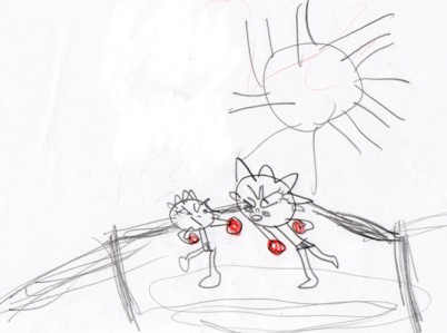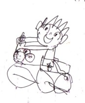 ♪きのう はぐれ~た 狼が~ 今日は リングで 血を流す あした~を~はっ! こんばんわ、やまげんです。しばらくのご無沙汰でございました。子どもが春休みに入りまして、毎日大騒ぎです。朝っぱらから大将うーたが遊びに来ます。「遊ぶのは9時からね」って約束ですがへたすりゃ7時過ぎから家の周りをウロウロしています。お昼のサイレンがなるとご飯を食べに帰りますが帰った後の部屋にはお菓子の袋がうーたの抜け殻のように散乱しています。「うーたに食べ物をやったらいかん。 うーたが太りすぎるやろ?」とみょみょこに言うと「だって、うーたが食べたいっていうんやもん。 だめって言うたら、犬をけしかけるっていうんやもん。」そんな、脅すやつといっしょに遊ばんかったらええやん、と大人は思うのですが、子ども社会は事情がちがうようである。一昨日はうーたと共謀してみょみょこがばーちゃんのお金を失敬し、缶ジュースを買って飲んだということで私は頭が沸騰状態になりました。子どもは日々成長している。だから知恵がついて、いろいろやらかしてくれます。私たち親は、その都度、問題処理能力を試される。新米オカンの私はすぐに頭が煮えくりかえる。まだまだです。こういうとき、姑やうーたのばあちゃんなど先輩たちの対処は本当に勉強になります。余裕が違います。肝っ玉母ちゃんはかっこいい。母親業にも道(タオ)があるなあと思います。なにごとも修行修行。明日もヨロシク。**********ところで日記が更新できなかったのは、BS2で、五夜連続やっていた「あしたのジョー」を見ていたせい。本日が最終日です。↑みーた画「ジョーVS力石」♪行け 荒野を おいら ボクサー