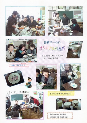 10月に開催した陶芸教室での作品が完成し、まんぷう窯さんから届きましたので「世界で一つのオリジナル作品展」を開催しました。みなさん自分の作品を手にして出来栄えの素晴らしさに歓声を上げ、お互い見せ合いながらお茶とお菓子で盛り上がりました。 同じ町内に居ても交流が無かった人とも笑顔で語り合い、生活学校のことも知っていただく機会になりました。