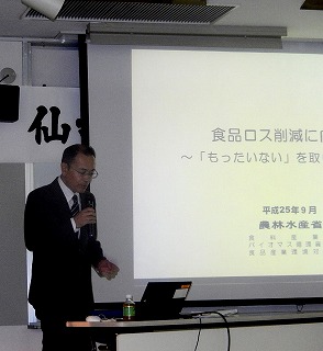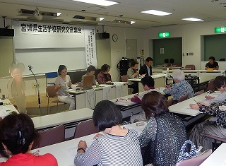 宮城県生活学校研究集会が開催されました。 日時 平成26年9月24日(水)午前10時~12時会場 エル・パーク仙台 セミナーホール開催テーマ 「食品ロス削減」に向けて ・・・・食材の使いきり術を考える・・・・・研修内容 各ブロックからの発表テーマ 「私の食材使いきり術」 仙南、仙台、仙北、仙石ブロックの各代表が食品ロスを出さないための日頃の工夫や アイディアを発表しました。 それぞれの家庭の状況(年齢、家族数)、地域性(街中、郊外、農村)により「ロ ス」 として発生する食品等に差異があることが分かりました。 ・近所付き合い、親戚付き合いが多いと贈答品をダメにしてしまうことが多い。 ・郊外に住んでいると皆さんから季節毎の野菜をいっぱいいただく。 捨てることがないようにいろいろな方法で使い切る。 (酢漬け、塩漬け、乾燥、冷凍) ・ひとり暮らしになってレトルト食品を利用する回数が増えた。(ロスが無い) ・冷蔵庫の点検をしてから必要なものだけを買う。 ・手間暇かけて保存食にしたものを忘れないようにする。 ・常日頃食材の3R(Reduce発生抑制、Reuse再使用、Recycle再生利用)を心がけ ている。「私の食材使いきり術」 皆さんそれぞれ違った視点からの「食材使いきり術」の発表でした。 講評等 助言者 東北農政局 経営・事業支援部 事業戦略課 食品リサイクル係長 高 橋 清 昭 氏 東北農政局 食品リサイクル係長の高橋清昭様から「台所は主婦の職場、いろいろな工夫がある。このような場で情報を共有することはとても有意義なことです。また、おすそ分けし合うということは、近所の方と良好なお付き合いが見えます」と、感想と講評をいただきました。「食品ロス削減国民運動」を展開中!! 配付されたパンフレットから国、事業者、家庭における食品ロス削減を目指し「ノーフードロス プロジェクト」を展開していることを知りました。