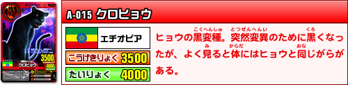 001 レオン(ライオン) ノーマル攻撃 7000体力 7000002 サマー(ホホジロザメ) ヘビー攻撃 6500体力 7500003 エアロ(ハクトウワシ) スピード攻撃 7500体力 6500004 アイス(ホッキョクグマ) ヘビー攻撃 5500体力 7000005 ゲンノウ(アカシュモクザメ) ノーマル攻撃 6000体力 6500006 ライデン(インドコブラ) スピード攻撃 6500体力 6000007 コレオン(ライオン) ノーマル攻撃 5000体力 5500008 サマーJr(ホホジロザメ) ヘビー攻撃 4000体力 6000009 エアロス(ハクトウワシ) スピード攻撃 5500体力 5000010 アングワ(ヨーロッパオオカミ) ノーマル攻撃 5000体力 5500011 ダンダン(ジャイアントパンダ) スピード攻撃 5500体力 5000012 ナイル(ナイルワニ) ヘビー攻撃 4500体力 6000013 ライト(チーター) スピード攻撃 3500体力 3000014 イエロー(ヒョウ) ノーマル攻撃 3500体力 3500015 シャドウ(クロヒョウ) ヘビー攻撃 3500体力 4000 「登場アニマル紹介2へつづく。また、この作品はフィクションであり、また、実際のアニマルとかには一切関係ありません。」