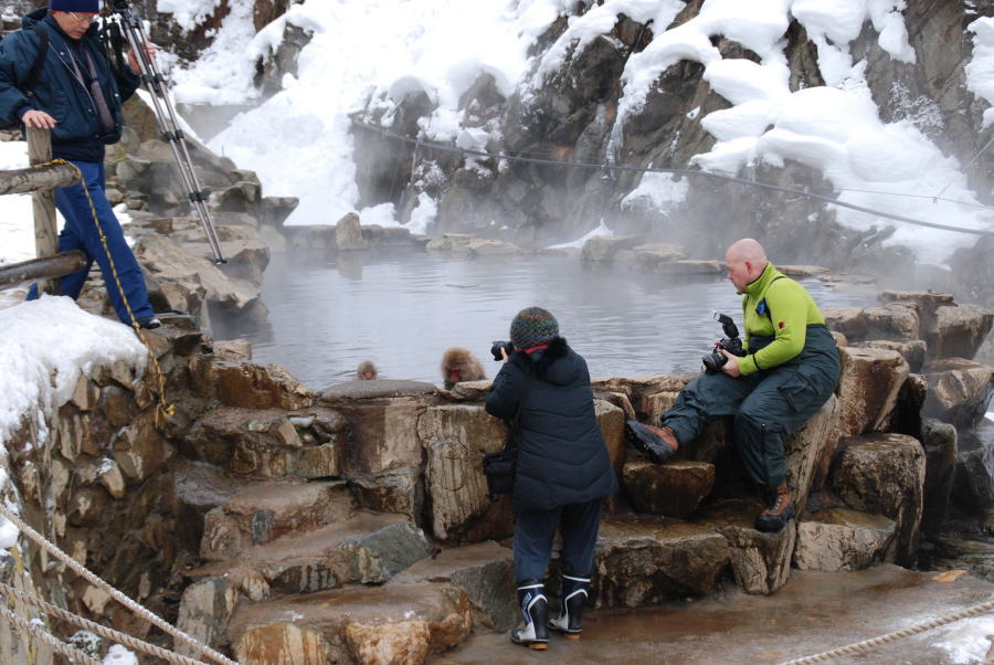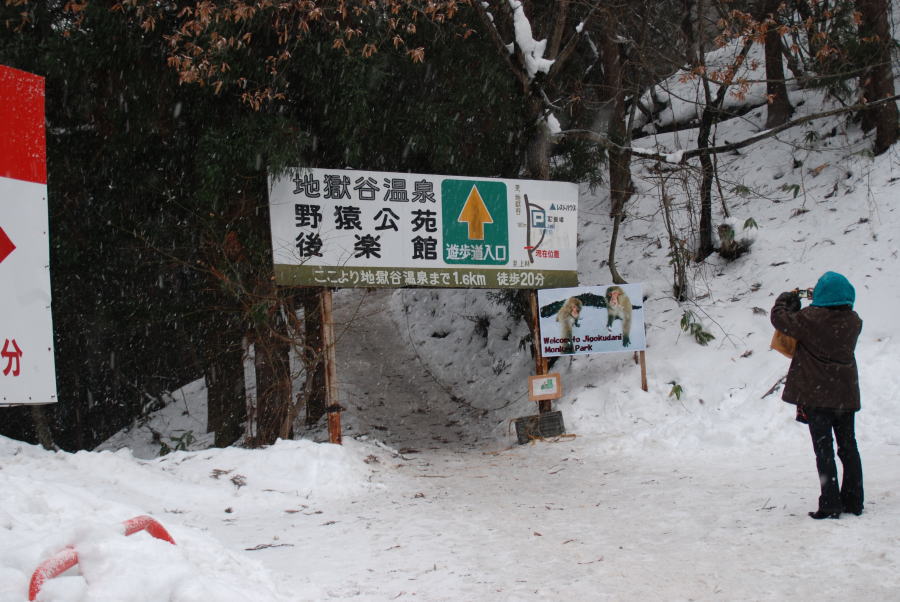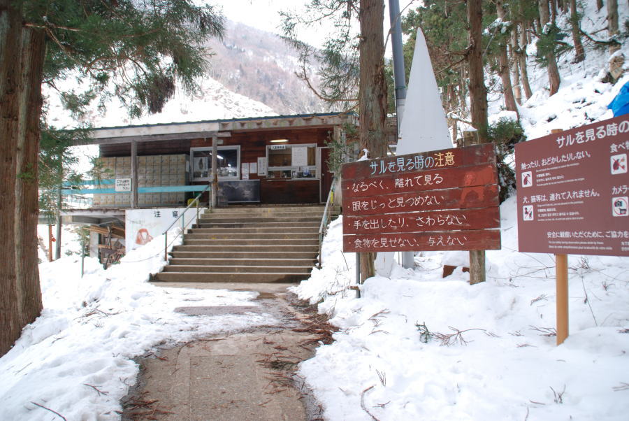 長野県上林地獄谷温泉には、冬の寒い時には露天風呂に入る野生の猿たちがいる。餌付けはされているが、自然のままの状態が見られる。実は野生の猿が湯に浸かるのは珍しいそうで、アメリカの雑誌、ライフの表紙を飾ったこともあるとか。その所為かどうか外国人が多く見物に訪れる。この野猿公園では、全く人間を恐れないので すぐ近くで写真を撮っていても無心で餌を食べている。子猿もです。そんな様子を2回に分けて、アップします。野猿公苑まではここから約30分歩く。雪がある時は車では行かれない。野猿公苑に一番近い宿。私たちはここに泊まった。宿、玄関の屋根には大きなツララ。下を歩くときはちょっと急ぎ足になる。!(^^)!宿の玄関を入ったところ。ストーブが点けてあってお客の靴などを乾かしてある。二階に上がる階段も相当古く、歴史を感じる宿。木造5階建てだそうです。この宿の裏にある露天風呂。男女混浴の表示が......この写真には猿の一団が写っていて、一匹が入浴している。夜になると宿の温水を通すパイプで暖を取る猿君。この日は外国人も同宿していた。オランダから来たとか!女性用の露天風呂。誰も入って無かったのでこっそりシャッターを......実は同行の女性が誘導してくれたので撮れた。(*^^)v