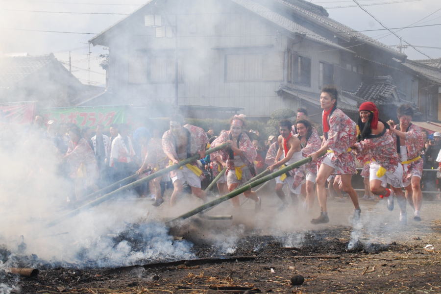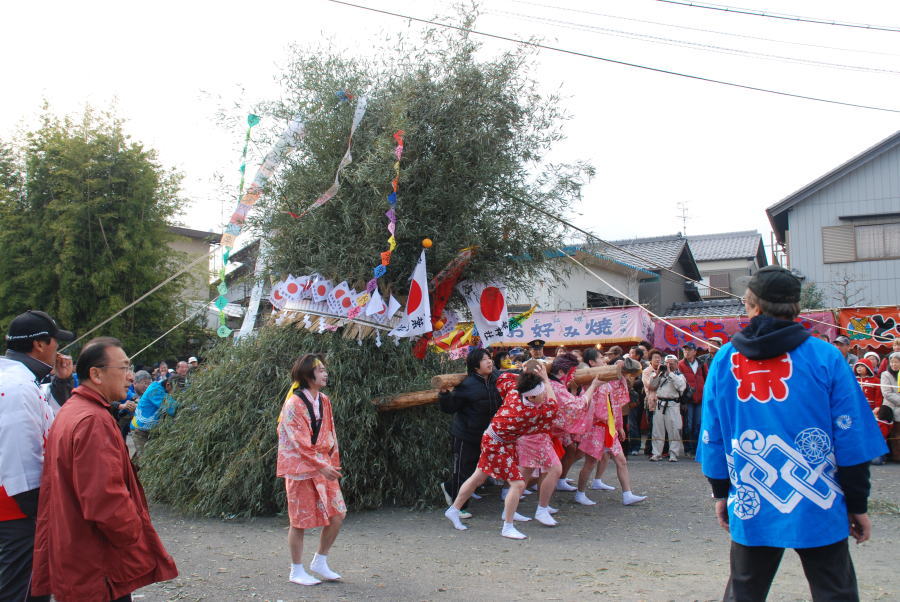岐阜・海津市平田町今尾では伝統的な左義長が、旧暦1月17日に行われる、正月行事の一つで「どんど焼」とも呼ばれる。大規模な左義長であり、高さ6メートル、重さ約2トンの青竹で組まれた竹神輿を、秋葉神社に運ばれ氏子により点火される。最後はその年の恵方の方向に倒して吉凶を占い、女性は参加出来ない祭りであり、400年前から行われているようだが、はっきりは分からないらしい。岐阜県重要無形民俗文化財に指定されている2回に分けてアップします。2トンもある竹神輿が境内に入ってくる。境内に着いた神輿を回す。所定の位置につけ、点火を待つ。前の組の残り火で氏子が火種を取る。神輿に点火です。ある程度燃えたところで、次の作業が待っている。これからがクライマックスの作業をする氏子が待機している。次回 Part2に.......