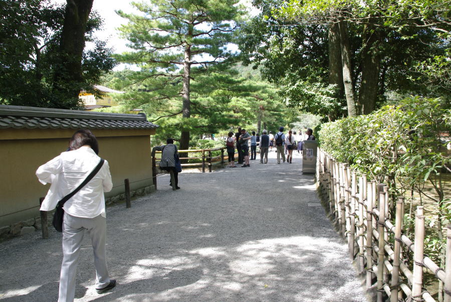 京都を観光する人は一度は訪れる「金閣寺」正しくは寺全体を「鹿苑寺」と言い、足利義満の法名から付けられた禅寺。中心となる舎利殿のことを金閣と言い、金閣舎利殿と言われるが、一般的に金箔を貼った舎利殿を、通称・金閣寺と呼ばれるようになった。金箔を貼るのは三層建ての内、二・三層で一層は貼らない。金閣時は国宝に指定されていたが昭和25年、僧により放火されて全焼した。資料をもとに昭和30年に再建され、現在金閣寺は世界遺産に、また庭園は特別名勝に指定されている。昭和62年には金箔貼り替え修復がされている。京都は時々行くが、金閣寺は久しぶりに見に行ったきた池の反対側から見た金閣寺太陽が当たると眩しいくらい.......修学旅行生?観光客が多くいた。外国人も....一層目は金箔が貼られてないので地味に感じる屋根には鳳凰の飾り。三層目の軒下には「究意頂」の額が掲げられている。 究意頂=上層の意鳳凰の飾り。昭和25年の放火事件時には取り外してあって火災を免れ現存する金閣寺の裏側夕佳亭 江戸時代の茶席。南天の床柱で有名