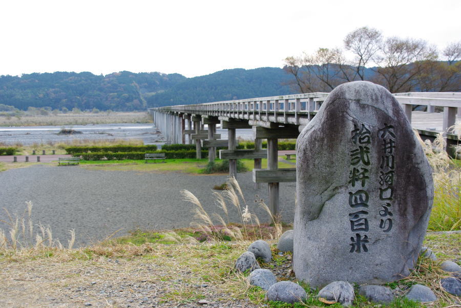 静岡県島田市にギネスに認定されている橋がある。大井川に架かる世界一長い木造の歩道橋。今では珍しい賃取橋(有料橋)で、大人一人100円、子供10円。1879年(明治12年)大井川の島田市側から右岸側にある牧の原台地の茶畑に渡るために架けられた橋で、長さ897,4米、幅2,7米。歩行者と自転車専用橋。大井川の増水により何度も被害を受けるので、昭和40年に橋脚をコンクリート造りにされた。平成19年の台風では被害を受け、途中で通行止めになり部分的に解放されていたが、今は全面復旧して対岸に渡る事が出きる。往復約40分の散歩を楽しむことができる。無料の駐車場数十台分も近くにあり、年中無休だそうです。蓬莱橋ライブカメラの映像大井川河口より12、4kmの石碑が立ててある。対岸は牧の原台地方面。橋の入口には「通行料金は先にお払いください」の立て札が......(島田市側に)左岸にはサイクリングロードが整備されている。ところどころ修理した痕跡が見られる。欄干が低いので(50センチくらい)、歩く時は自然に中央を歩いているのに気づく。夜間にはソーラーブリックが光る。かなり盗難に遭うらしく、無いところもかなりある。牧の原台地側の橋の入口。右岸側の初倉には、何故か愛和の鐘や.......(誰でも撞くことが出来る)貝群の化石がある。右岸側の初倉から市街地を眺めた、橋の全景。
