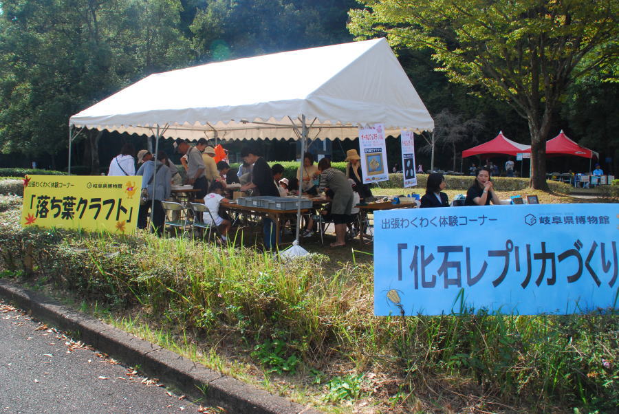 岐阜県関市の百年公園では、秋祭りとしてオータムフェステバルが2日間にわたって開催され、天気にも恵まれた事もあって多くの人達で賑わった。ステージでは、踊りあり、幼稚園児の太鼓あり......その他特産市や焼き芋販売等々。近くの中学校の茶道部の生徒による野点も........そして岐阜県博物館はさまざまな体験コーナーを設けたが、その中で我々達は、わくわく体験コーナーとして、「化石レプリカづくり」「落ち葉クラフト」を担当。そんな雰囲気をご覧ください。博物館のコーナーは、広場にテントを張って出張体験ブースを.......化石レプリカつくりは、石膏を化石の型に流し込み作る。表面の実際の色は想像するだけで、今でも分からないので後で好きな色に塗る。落ち葉クラフトは、文字道理落ち葉を台紙に貼って..たとえばフクロウを作ったりする。作る人の発想でいろいろ楽しめる。実は落ち葉集めがかなり大変だったし、ある程度の下準備も必要。さ~て!どのようなものが出来るかな!う~ん!お見事、可愛いくできましたね。こちらはシャボン玉作りのパフォーマンス。地域の名物の屋台が並ぶ。籾殻を使っての焼き芋作り。珍しい光景だった。ちびっこ達の太鼓演奏岐阜清流国体ゆるきゃらのミナモダンス。動画はここをクリックして下さい。