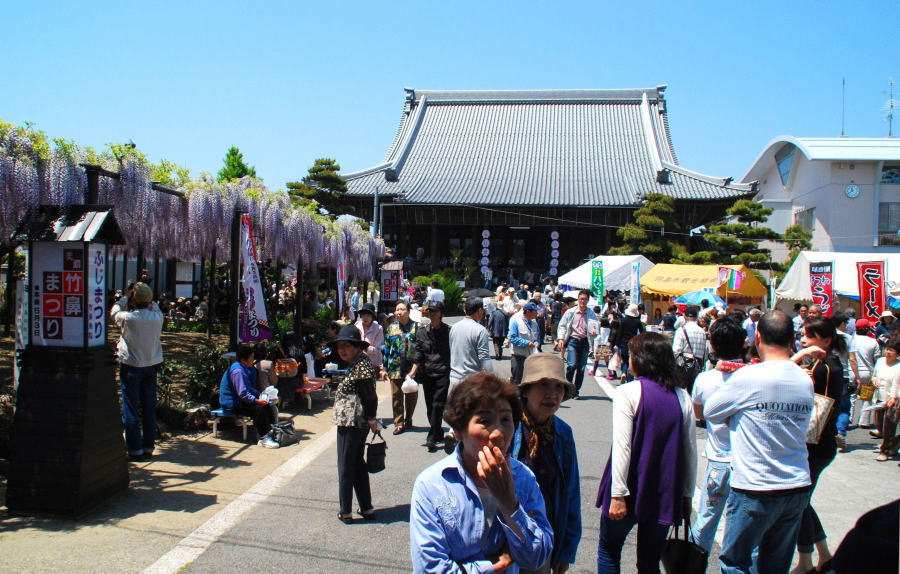 岐阜県羽島市竹鼻町に、真宗大谷派竹鼻別院がある。創建は800年以上前の寺院。この境内には樹齢300年以上と言われる1本の藤がある。東西30m、南北15mの大きな木であるが、毎年見事な花をつけ、岐阜県の天然記念物に指定されいている。蔓は長く伸びた見事な姿で、これでもか~とアピールをしている。毎年4月下旬~5月上旬にかけてフジ祭りが開催され、大いに賑わいを見せている。今年も満開のフジの花を撮ってきたので堪能あれ!!今年のゴールデンウイークは快晴の上天気が続きフジも満開。上から見たところのフジ。これが1本のフジかと思われるくらいである。
