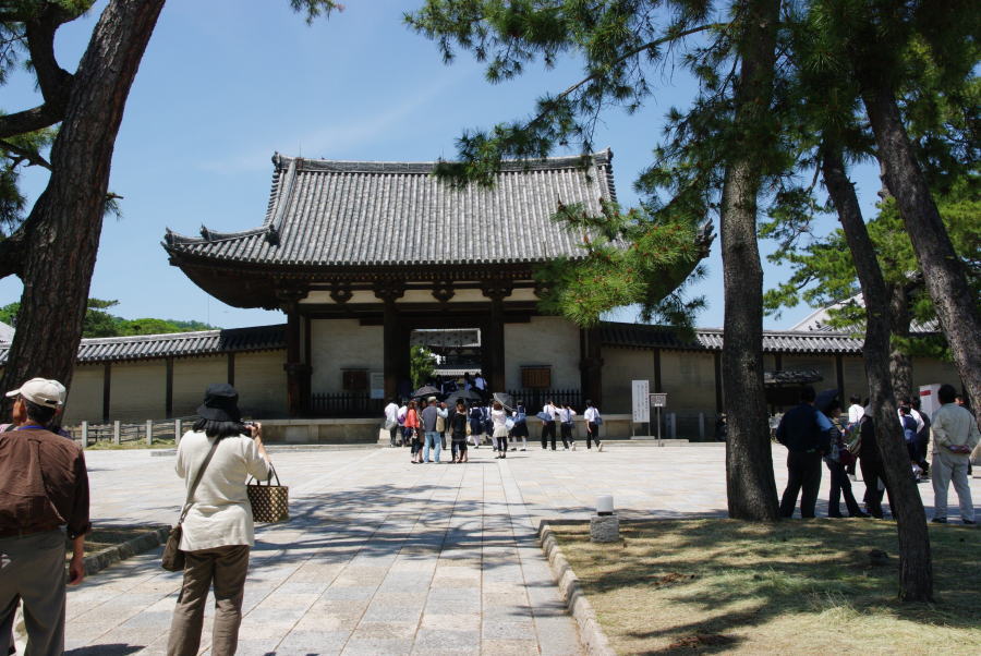 奈良は遷都1300年祭が開かれていて、見に行きたいと言う衝動にかられるが、今は歴史ブームが広がっているので、異常に?混雑しているところへはちょっと遠慮して、奈良の法隆寺を改めて見聞することにした。法隆寺はやはり思った通り、多少の人出はあったがそれほど混んでなくて、修学旅行生の団体を除けば、比較的のんびり出来た一日であった。遷都1300年はまた時期を見て行ってみたいと思った次第。奈良・法隆寺紀行はHPに載せたのでここをクリックしてください。参道を進んでくると、最初に見える法隆寺境内寺の国宝・南大門南大門から右を見た塀中門に立つ仁王像法隆寺のシンボル、国宝・五重塔五重塔の横に建っている国宝・金堂金堂の軒下の柱に巻きついている龍の彫り物。修学旅行生か、アルバム用にって撮っていた。