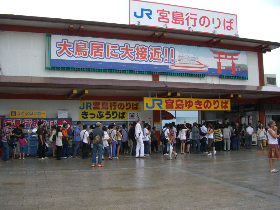 日本三景の一つ、安芸の宮島へ行って来たので三回に分けて紹介します。国宝でもあり、世界文化遺産でもある厳島神社は、天気があまり良くなかったがやはり観光名所,平日にかかわらず渡船の乗客は一杯だった。(夏休みと言うこともあるが)ただ、我々は(3人で行った)朝早くに行ったためか比較的空いていてゆっくり回れたが、帰る頃には多くの人で賑わってきた。因みに日本三景=丹後の天橋立 - 陸奥の松島 - 安芸の宮島宮島へ渡る船を待つ人たち。宮島へ渡る船連絡船から見た大鳥居。左に厳島神社が見える。日本三景の碑参道1参道2この鹿君、帰りにも同じところで頑張っていた。餌が貰えると思ってかな。島内には500頭近くの鹿が居て、増え過ぎて困っていると言う。Part2に続く.......