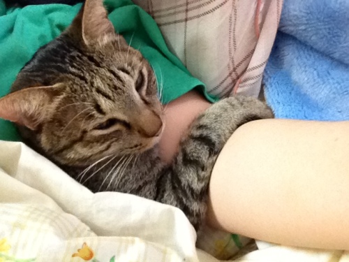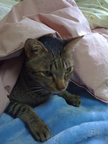 うちのてんまるです。最近はほとんど寝るばっかしです。今日私がアバターしてた時、遊び相手をしてあげないからだと思うんだけど、急に動き出してね。布団をのせてる棚があるんだけど、そこに飛び上がろうとして・・・・落ちました!布団が思いのほか滑りが良くて、登りきれずに、滑ってドテッ!と(ネコなのに)落ちちゃった!・・・で、自分でもショックだったみたいで別の部屋に(隠れに行ったらしい)走って行きました。いつもなら、「てんちゃーん!どうしたのぉ。だいじょーぶぅ」って呼んであげるんだけど、アバターでお楽しみ中だったので放置してたら・・・・・すぐに戻ってきて、すりっと寄ってくるので(ああ、慰めて欲しいんだなぁ)とわかったから撫で撫でしてあげました。手が触れる一瞬、身体がビクッとしたので、よっぽど落ちた時にびっくりしたのねぇ。急に遊んでくれないからって拗ねるからだよぉ。落ちそうになった時は、何もなかったふりするくせに・・・!今は隣でゴロゴロ・・・です。とにかく寝てばっかりです・・・。ちょっと顔を出してみたりはするんだけど、すぐ眠そうになって、またもぐっちゃう。