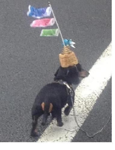 昨日の夕方のことです!またまた、とんでもないものを見つけました!「こいのぼり犬」です!私の目の前を飼い主さんと並んで、お散歩?てとてと・・と歩いて行くんですが・・・・。頭の上に、なんと!こいのぼりがぁぁぁぁ!飼い主さんと鯉のぼり犬は何事もないかのように横断歩道を渡って行ってしまいました。すれ違う人もにこっとする位で、全然ふつうでした。わたしだけびっくり!なの?