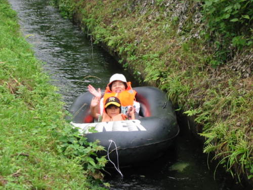 先週土曜日、「ざんぶらこっこ」の自然の遊びに参加しました。 ゴムボートを用水路に流して、涼とスリルと思い出を満喫するイベントですが、これがなかなか面白い”うきうき”するもので、800Mの距離もとっても長く感じるものです。 子供さんは、船の形状を変えて流れに親しむのが、冒険に通じるのか、びしょぬれで水に戯れています。 途中、通路が頭上にあり、すくんで通過するのが又遊びをくすぐるものらしい。 800Mの終点から、陸路を原点まで折り返しますが、こどもさんは、歩くのがまちどうしく、走って上がってきます。 終点から軽自動車につんで、ボートを原点まで運んできます。このボートが間にあわないくらいでした。 この水路は、先人が、大山の豊富な水量の川から、サイホンの技術まで駆使して、水なき荒野に水を配し、水田開発をした広大無辺の事業の賜物です。 今は、豊かな穀倉地帯として豊かな地帯になっています。 年中、変わらぬ水量をながす水路は、これを維持する人たちがあればでしょうが、地域の人情に似て心強くかんじます。 カッパの川流れで、何もしないでも船に身をまかせるだけです。 この空がたまらなくいいのでしょう。 途中に”先人の発想”とか”自然の不思議”とか、クイズで考える看板があってもいいかな。 あそんで、利口になって、賞品もらって!など、など。 下界は熱中症で話題の1日、終日、水辺で涼しく働いたという満足感に、感謝、感謝の1日でした。