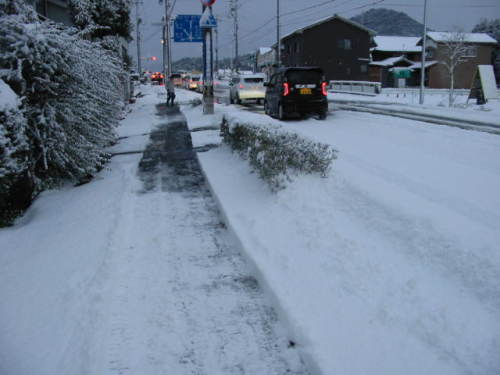 昨夜、天気予報でも大雪情報、腹をゆするようなドンドロケの雪起こしの唸りを聞くと、明日朝の雪掻きはチトしんどいぞと覚悟して早く寝ました。 今朝、寒さしのんで、玄関から出て驚き、歩道の雪掻きがしてあります。 市内へ向け小鴨橋方へのこの道路。 反対方向の日交へのターミナルに向けてのこの道路。 横断歩道口で佇む処もきれいになったこの道路 農高線の通勤道路も雪乗せた車がひっきりなしに通ります。 鴨川沿いの通学道路も、子供が2列で歩けるように除雪してあります。 わが班の班長さんです。インターネットで除雪機買ったと聞いてはいましたが、こんなに朝早くから、広範囲に、通勤者、通学の子共たちがどれだけ喜ぶかありがたいことです。 ついでに駐車場もしましょうかと隣の若者の出勤も滞りなく発車オーライ。 豪雪予報は、あんまり当たりませんで普通の雪でしたが、班長さんのこの屈託ない奉仕には、ビックリポンでした。 きょうは、鳥取湖山まで、大工仕事だと出勤していきました。 通学の子共たちが、白い息はきながら通っていきます。 横断歩道では、前館長と裏のおじさんが赤い服きて、子供たちを誘導しています。 「ごくろうさん」 今日も1日がはじまりました。